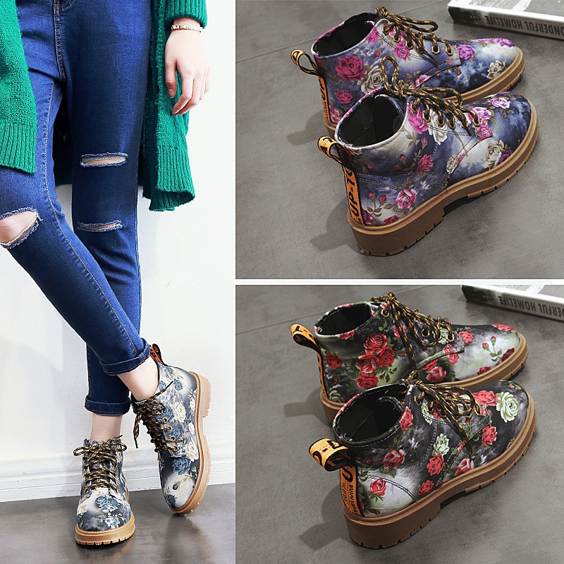 Promo MurahCowboy floral kasual sepatu wanita tunggal datar dengan sepatu bot Martin tinggi retro sayang jika tidak dibeli
